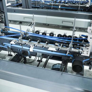 La máquina pliega el papel en la forma deseada (p. ej., cajas de cartón) siguiendo líneas premarcadas. Diversos mecanismos de plegado (p. ej., plegadoras de cinturón, plegadoras de hebilla o navajas plegables) garantizan una alineación precisa.